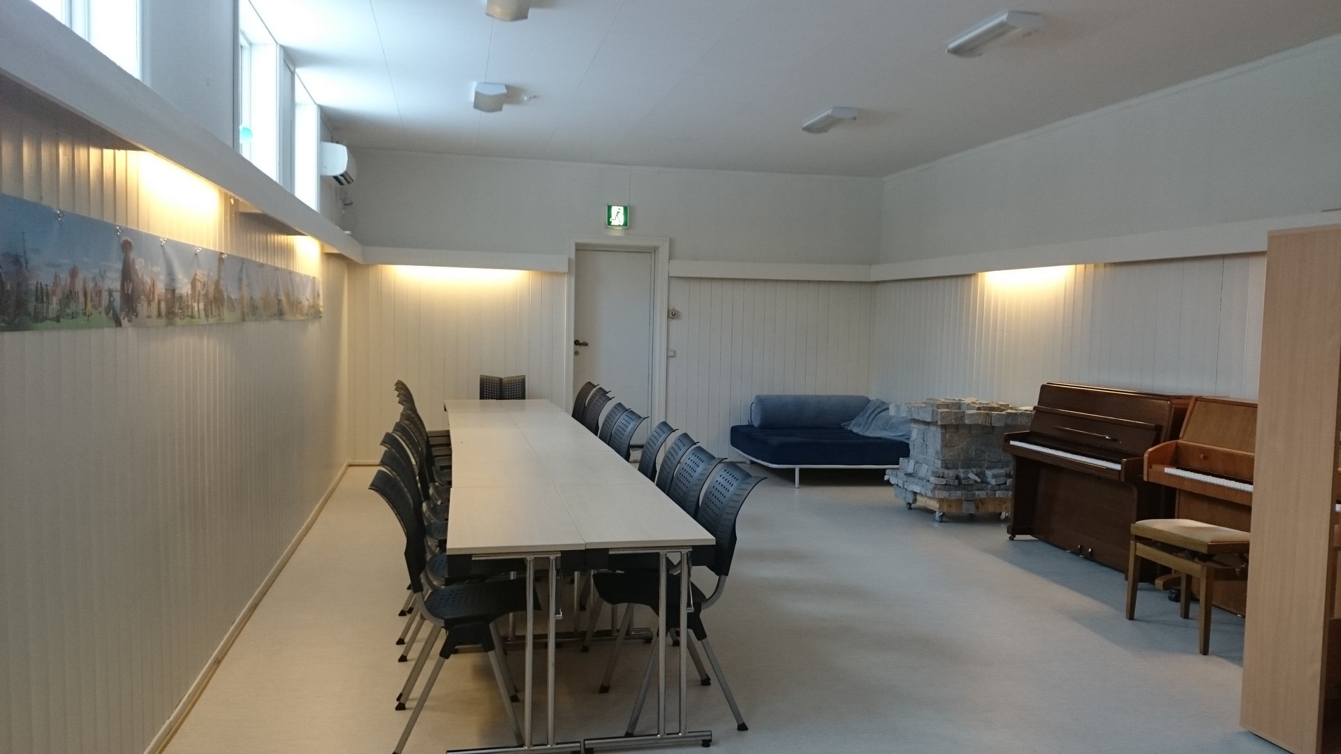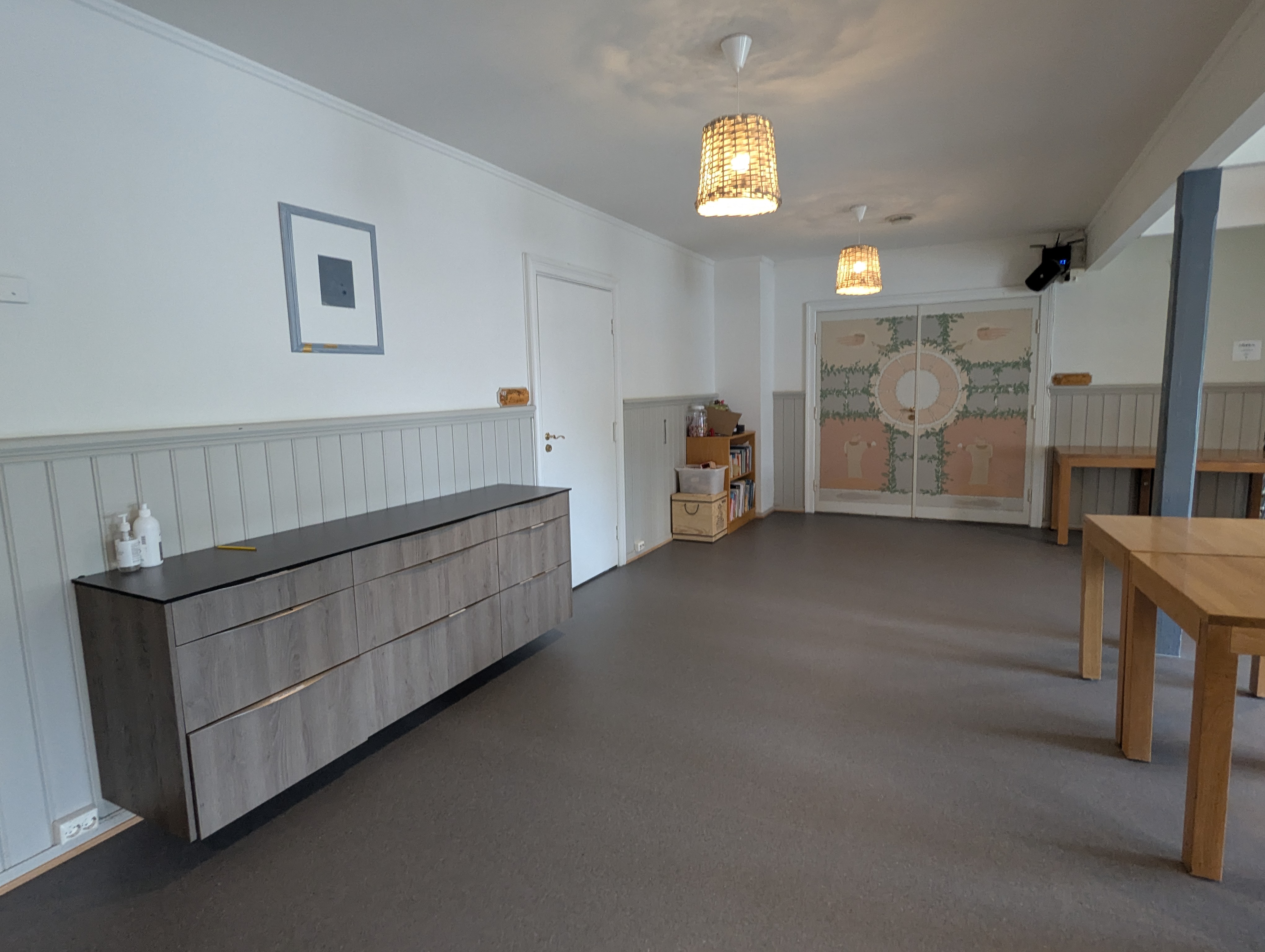 Aktivitetsrommet ligger i kjelleren og er nylig pusset opp (nytt gulvbelegg og malt). I rommet finnes piano, lite flyttbart "alter" og 10 bord/20 stoler. Smale kjellervinduer gir noe dagslys. I tillegg til taklys er det lysskinner på veggene. Det er utgang til bakgård/hage fra aktivitetsrommet, og rommet er oppvarmet med varmepumpe.