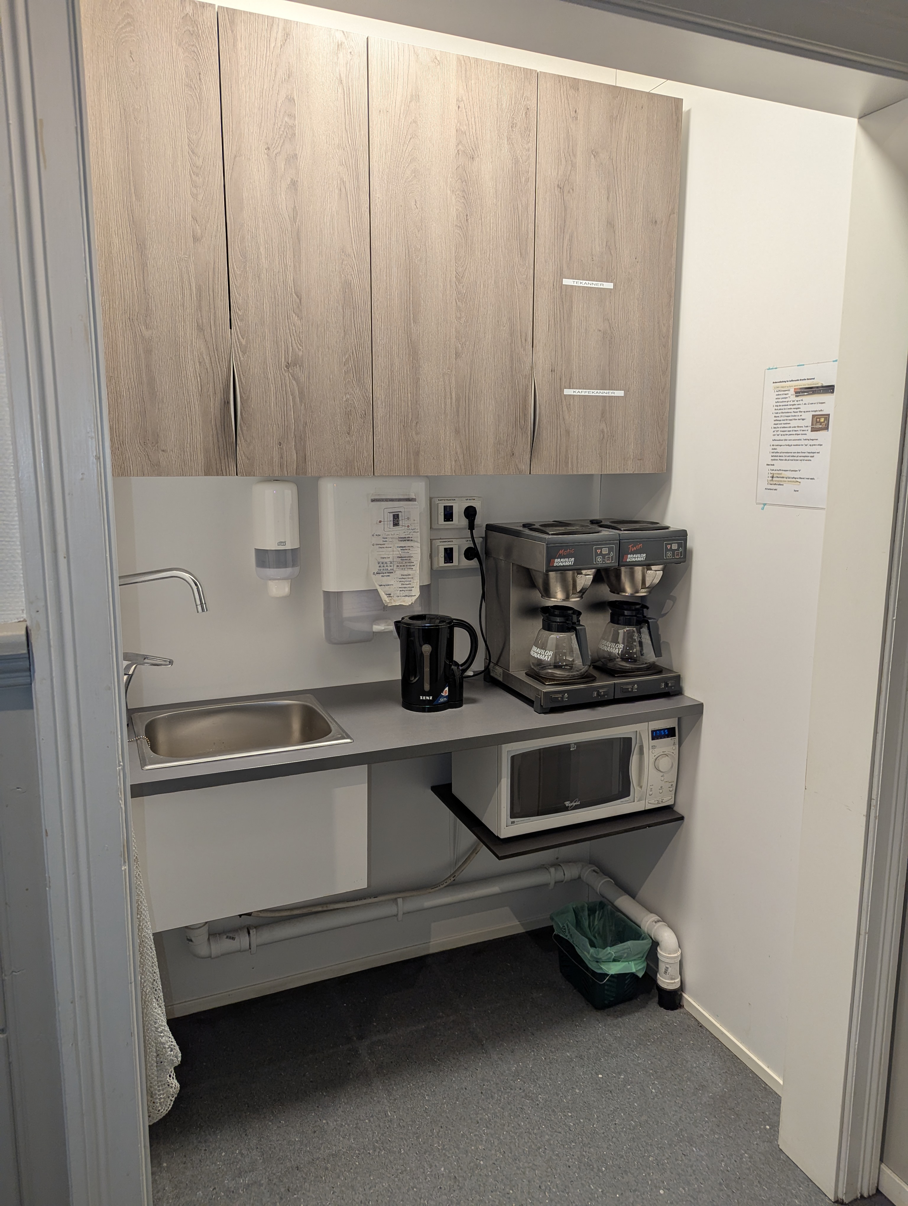Rett utenfor kjøkkenet har vi laget en kaffe/te-krok dobbel kaffetrakter og vannkoker, samt en mikrobølgeovn under benken..