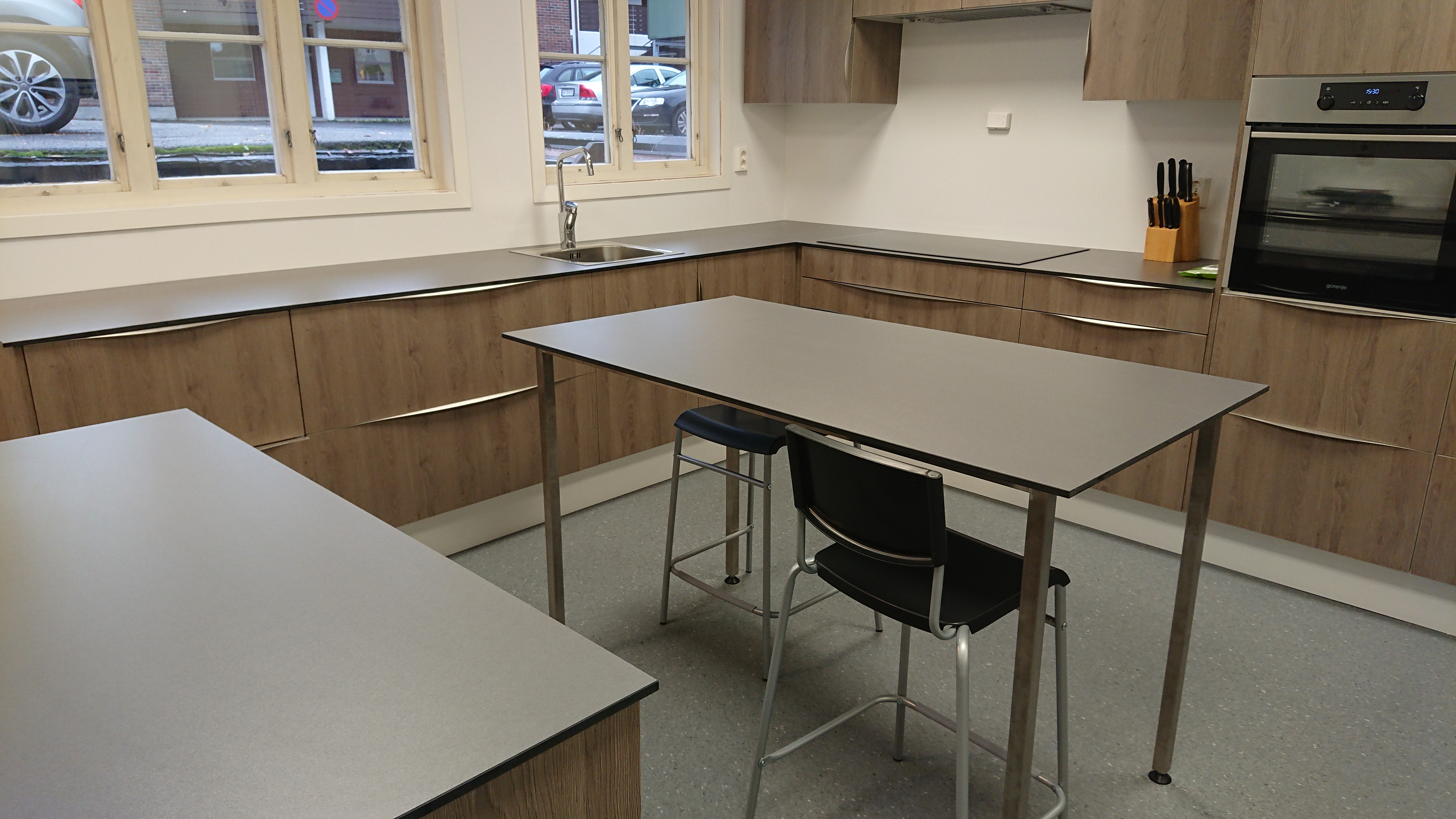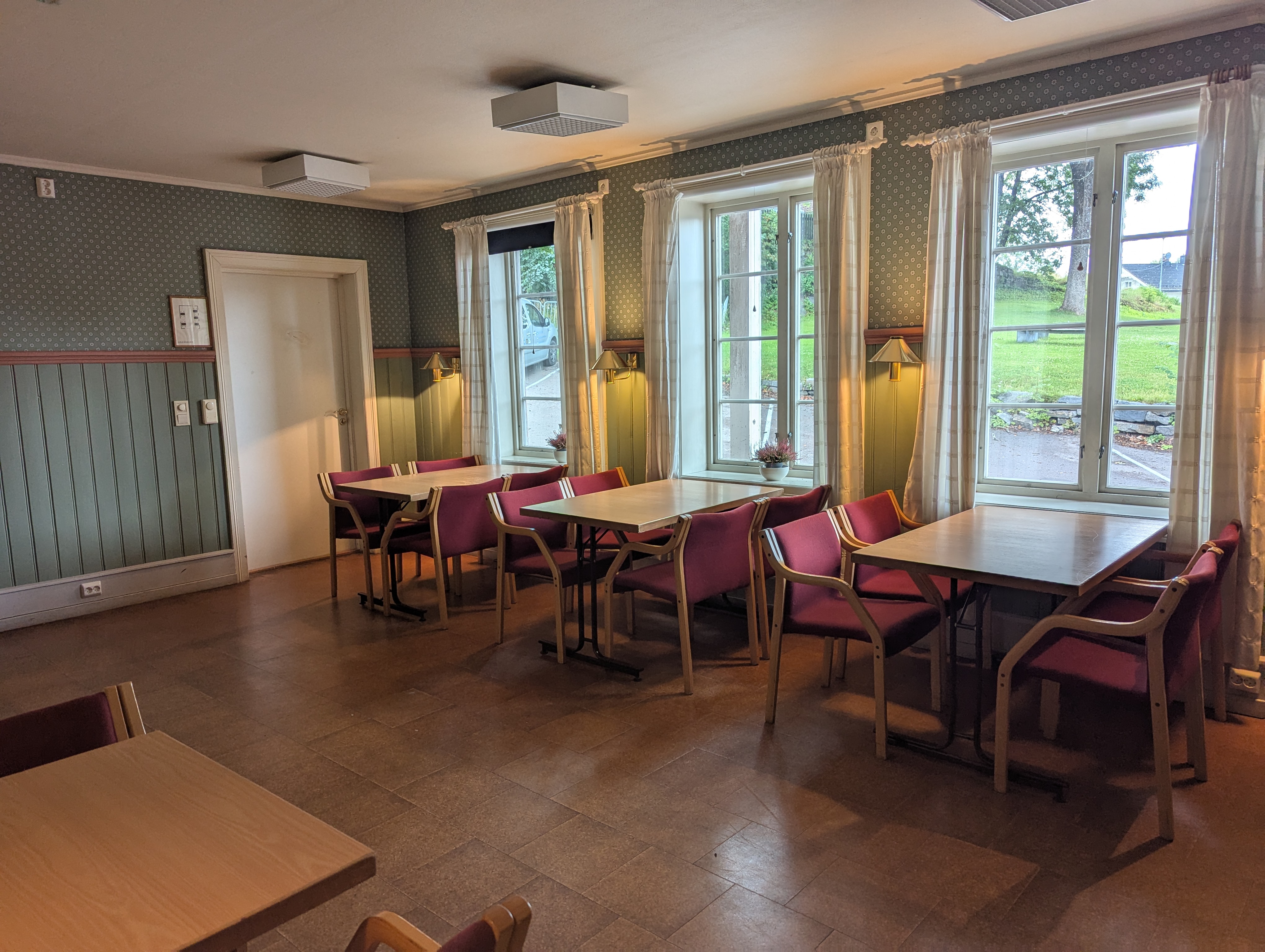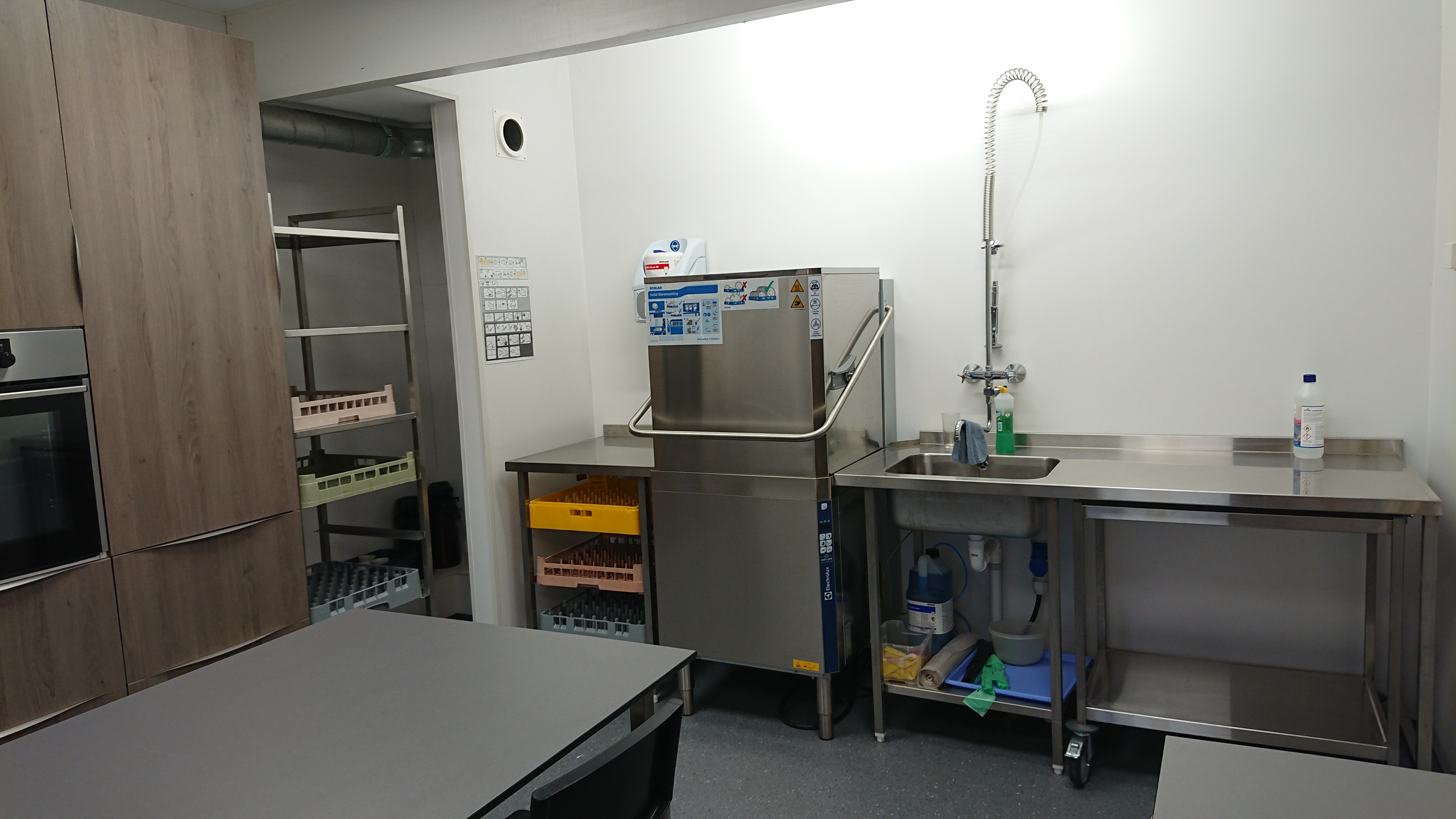 Vi fikk helt nytt kjøkken i september 2020. Her finner vi en proff oppvaskmaskin, 80 cm induksjonstopp med 5-6 kokesoner, stekeovn i god arbeidshøyde, et stort kjøleskap og et stort kombiskap kjøl/frys. Dekketøy til drøyt 100 personer plassert i lett tilgjengelige benkeskuffer. Glass til alle anledninger i et høyskap.