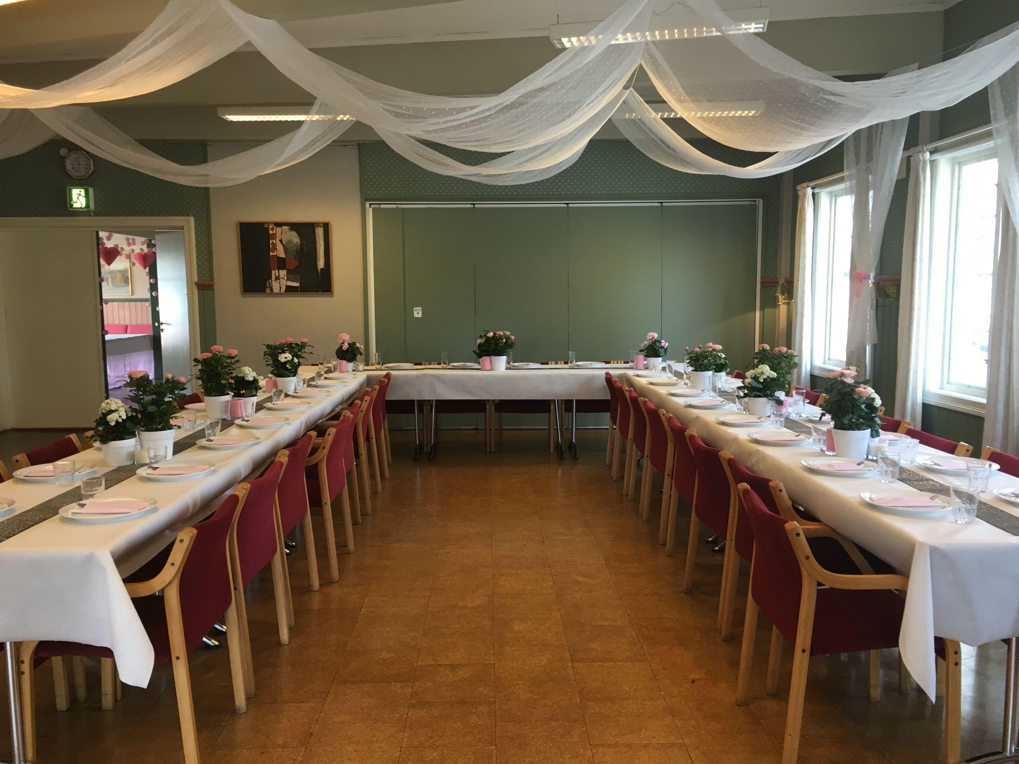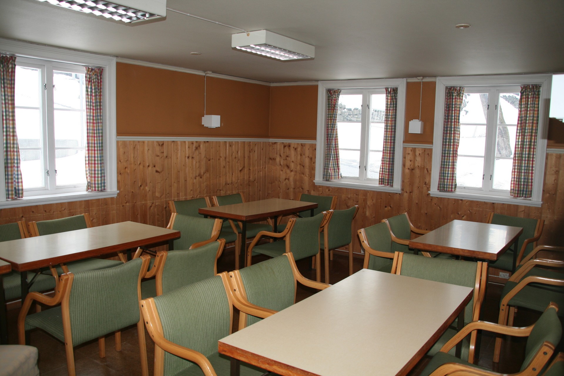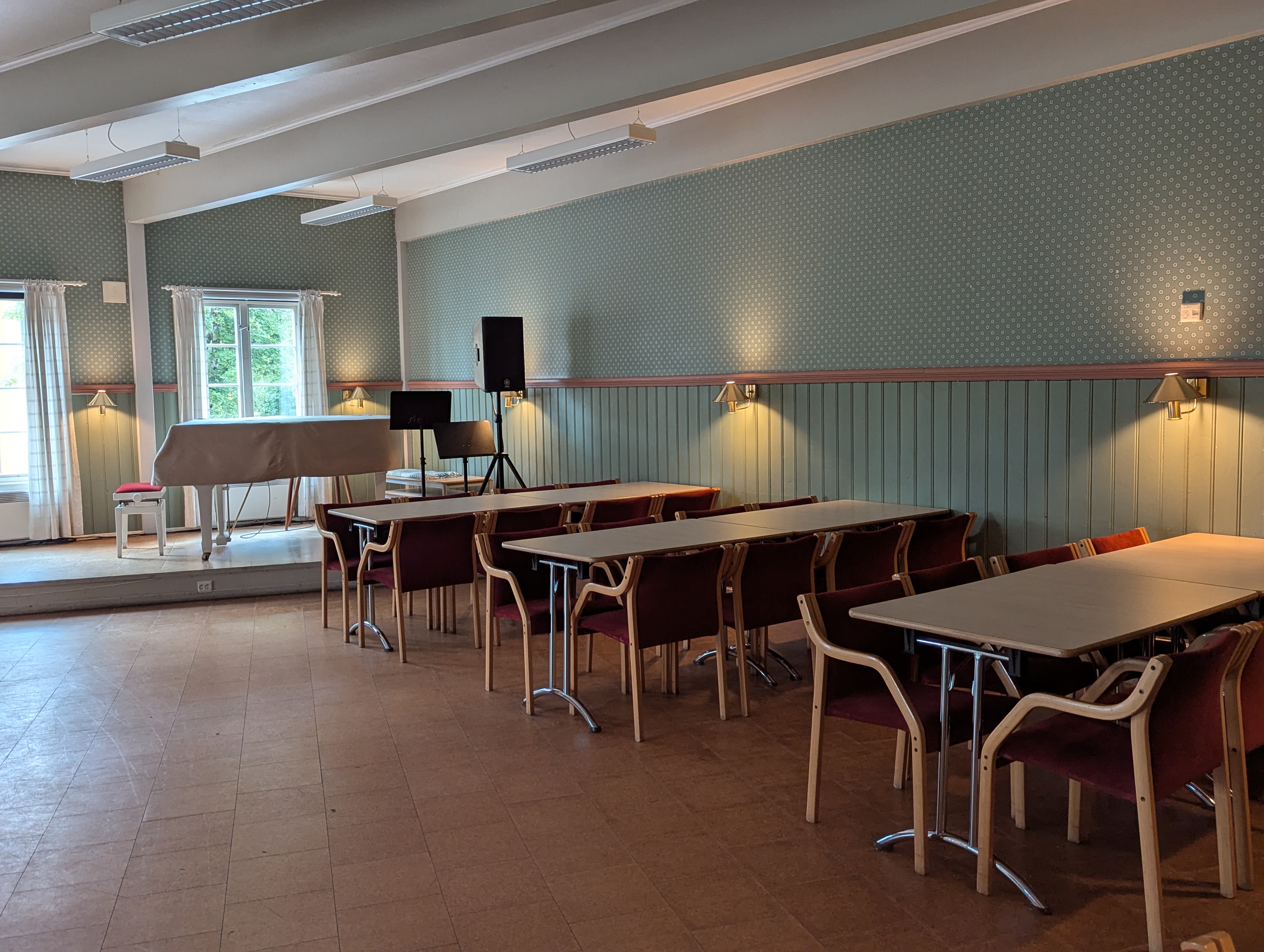 Vi fikk helt nytt kjøkken i september 2020. Her finner vi en proff oppvaskmaskin, 80 cm induksjonstopp med 5-6 kokesoner, stekeovn i god arbeidshøyde, et stort kjøleskap og et stort kombiskap kjøl/frys. Dekketøy til drøyt 100 personer plassert i lett tilgjengelige benkeskuffer. Glass til alle anledninger i et høyskap.